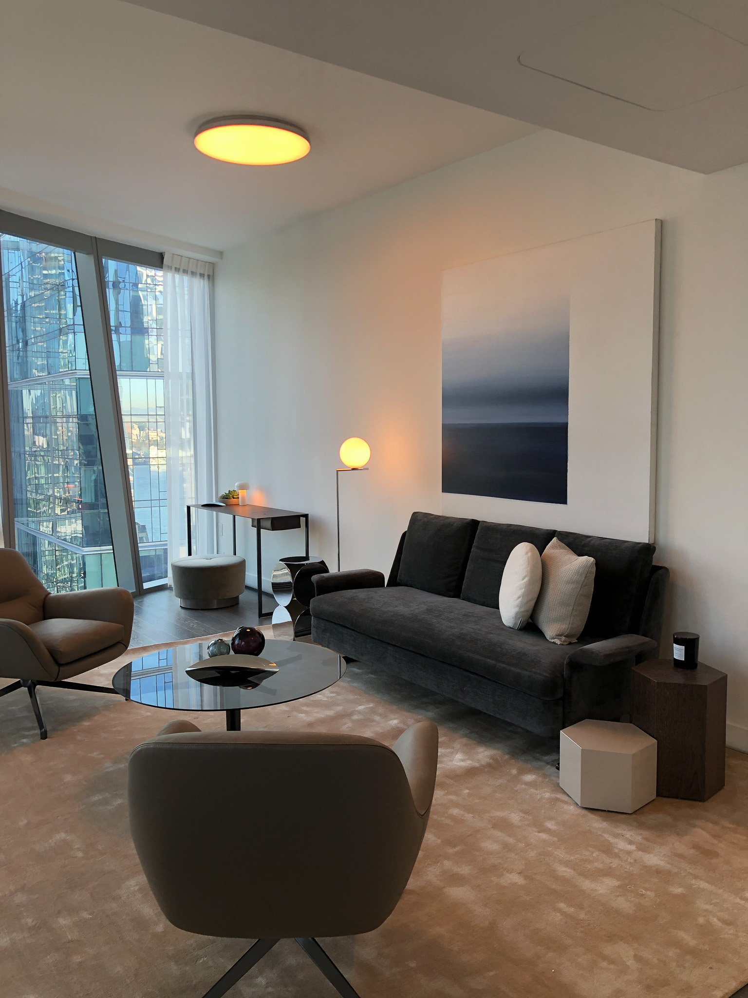The layout supports the client’s transient lifestyle through integrated storage and thoughtful spatial planning, making the apartment feel complete and functional without excess. Art and accessories were curated to add personality while preserving a sense of openness, allowing the architecture and views to remain central to the experience.