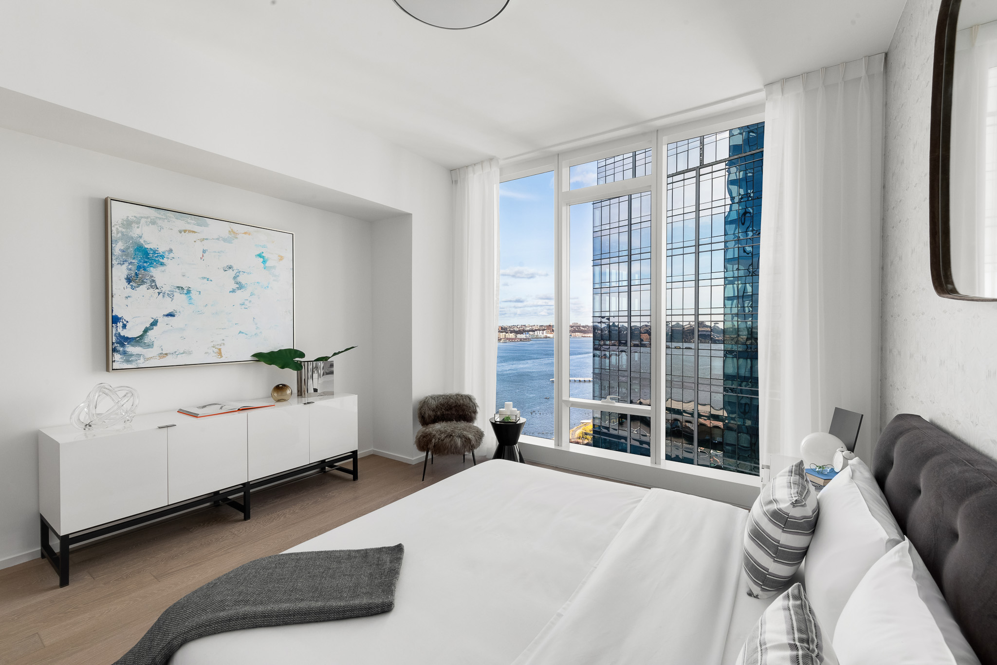 This pied-à-terre at Waterline Square was designed as a calm and contemporary retreat for a client who frequently travels to New York City for both work and leisure. The intention was to create a space that feels fresh, clean, and instantly welcoming, offering a sense of ease and refinement from the moment of arrival.